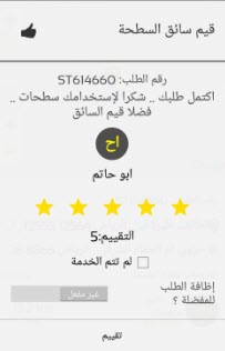 بإمكانك أيضاً تقييم مزود الخدمة بالنجوم بناء على جودة خدمات النقل على الطريق التي يقدمها، مع الأخذ في الاعتبار كل من سرعة الاستجابة والتوصيل والمعاملة وما الى ذلك، يذكر أن الحد الأدنى نجمة واحدة ويعني أن التجربة كانت سيئة للغاية، والحد الأقصى 5 نجوم.